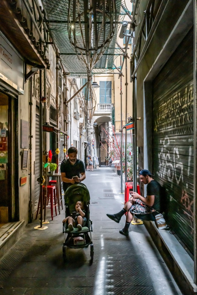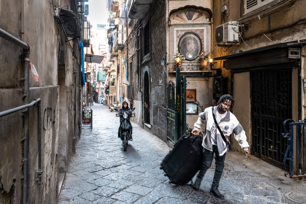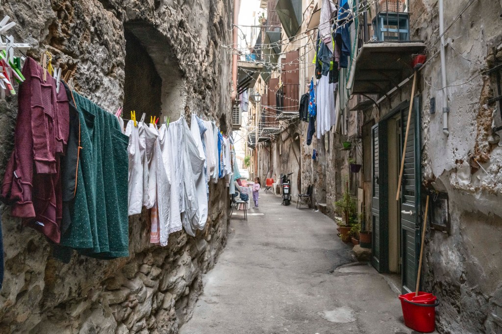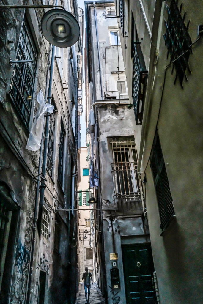 Piccoli cieli con luce fioca, dentro stretti e alti vicoli, tutti con lo stesso profumo del Mar Tirreno. Sono piccoli luoghi che appartengono alle città di Genova, Napoli e Palermo. Qui la vita quotidiana si svolge con naturalezza e vivacità. Il senso della realtà è prevedibile e pesantemente concreto, tutti con qualcosa da portare: una valigia, un materasso, un carrello pieno di merce o una carrozzina con un bambino.Questi spazi appartengono alle persone che ci vivono, fanno parte della loro casa e vengono riempiti con tavoli e sedie, sotto lenzuola stese che danno colore all’ambiente. Ho colto nei disegni, nelle scritte sui muri e negli occhi degli abitanti la voglia di volare per grandi cieli.