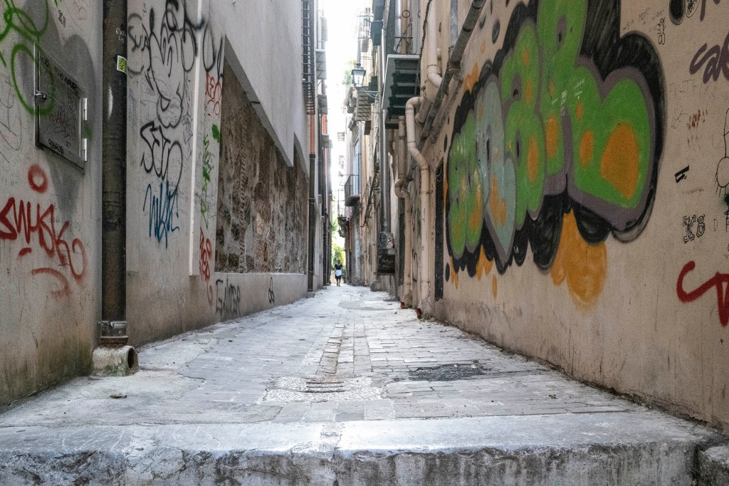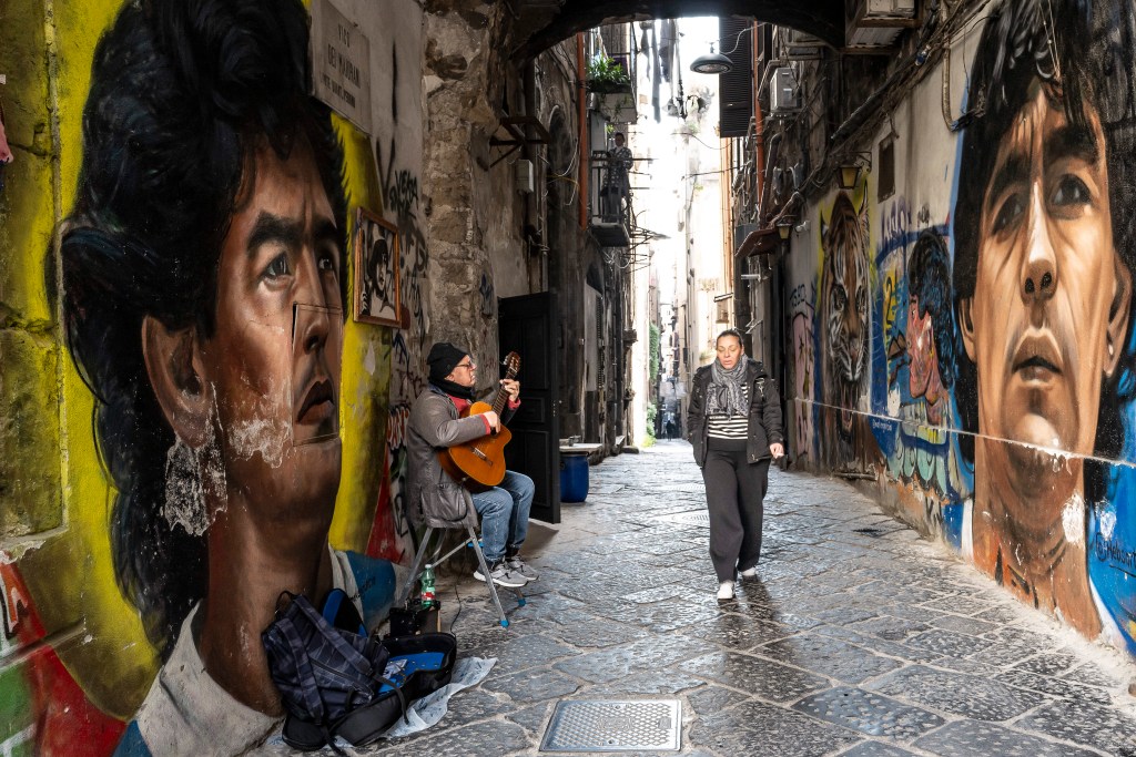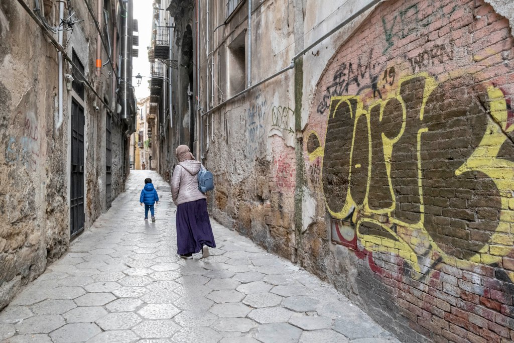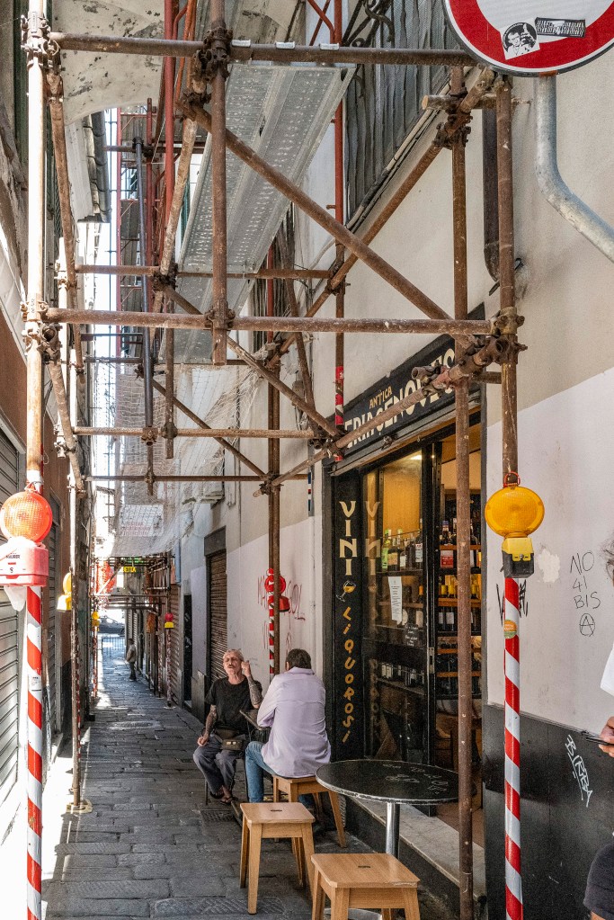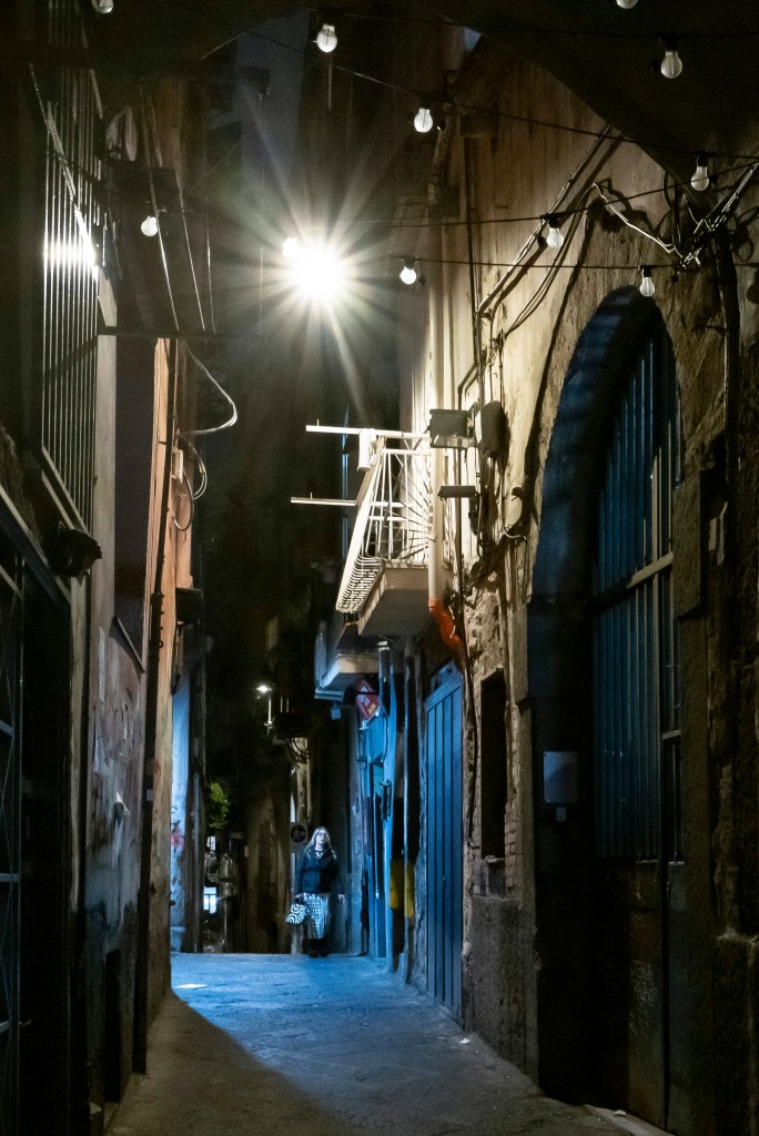 Piccoli cieli con luce fioca, dentro stretti e alti vicoli, tutti con lo stesso profumo del Mar Tirreno. Sono piccoli luoghi che appartengono alle città di Genova, Napoli e Palermo. Qui la vita quotidiana si svolge con naturalezza e vivacità. Il senso della realtà è prevedibile e pesantemente concreto, tutti con qualcosa da portare: una valigia, un materasso, un carrello pieno di merce o una carrozzina con un bambino.Questi spazi appartengono alle persone che ci vivono, fanno parte della loro casa e vengono riempiti con tavoli e sedie, sotto lenzuola stese che danno colore all’ambiente. Ho colto nei disegni, nelle scritte sui muri e negli occhi degli abitanti la voglia di volare per grandi cieli.